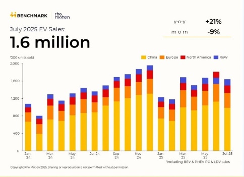 С начала этого года мировой рынок электромобилей вырос на 27 % (август 2025)Согласно информации глобальной исследовательской компании Rho Motion, за первые семь месяцев 2025 года в мире было продано 10,7 миллиона электромобилей, что на 27 % больше, чем за тот же период предыдущего года. Несмотря на то, что в текущем году продажи июля по сравнению с июнем упали на 9 %, они всё же на 21 % оказались больше, чем в июле 2024 года.