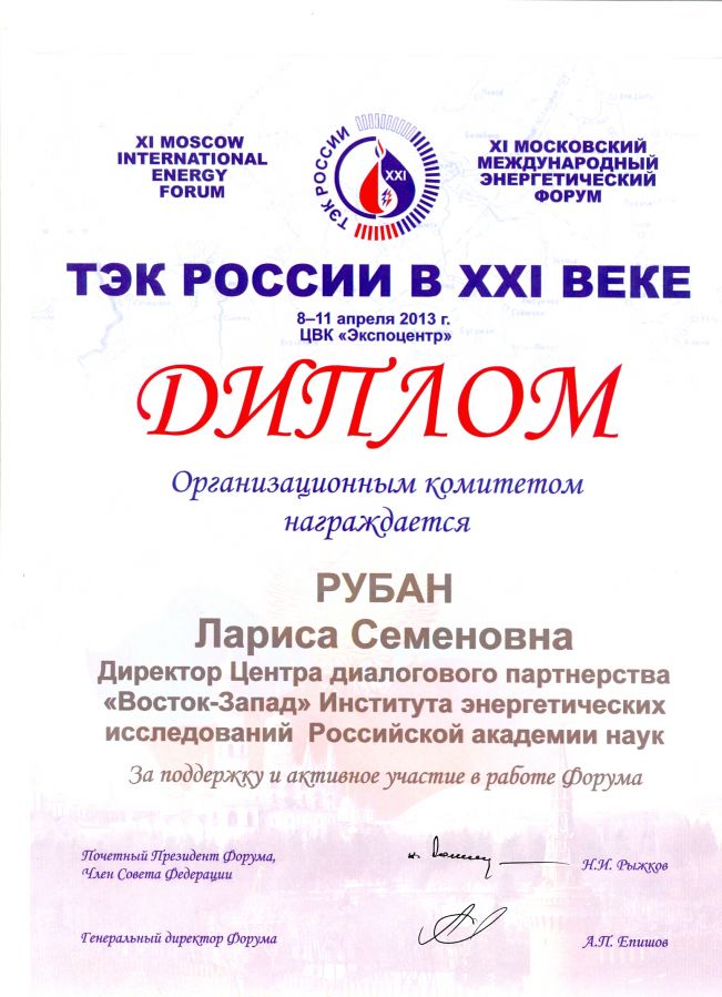 11 апреля 2013 года в рамках работы Форума на секции "ТЭК России на глобальных энергетических рынках: стратегия и тактика государства и корпорации" в МГИМО начальник Центра диалогового партнерства "Восток-Запад", д.с.н. Лариса Рубан выступила с докладом "Комплексная характеристика энергетической ситуации в АТР (в экспертных оценках)". В докладе приводятся материалы уникальных экспертных опросов, в которых в качестве экспертов выступали лица, принимающие решения, и специалисты высшей квалификации из 15 стран: Брунея, Вьетнама, Индии, Индонезии, Китая, Малайзии, Монголии, Непала, Респ. Корея, России, Сингапура, США, Таиланда, Филиппин и Японии.