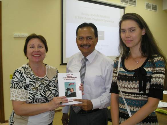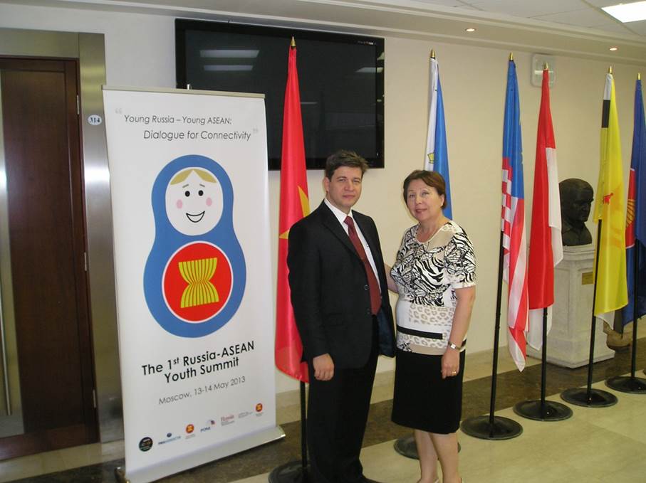14 - 15 мая 2013 года в Москве (в МГИМО И РИАН "Новости") прошел первый молодежный Форум АСЕАН и Круглый стол по вопросам сотрудничества РФ и АСЕАН, в котором приняли участие сотрудники ИНЭИ РАН - руководитель Центра "Диалогового партнерства "Восток-Запад", д.с.н. Лариса Рубан и аспирантка Алеся Незамайкова. В рамках Форума и Круглого стола иностранные представители были ознакомлены с деятельностью Центра "Диалоговое партнерство "Восток-Запад", входящими в него проектом и программами. Издания проекта были переданы в ряд стран АСЕАН в учебные и научные заведения Индонезии, Малайзии, Брунея, Сингапура и Вьетнама, а учебники по разрешению конфликтов и формированию толерантности – студентам из стран АСЕАН, обучающимся в Москве.